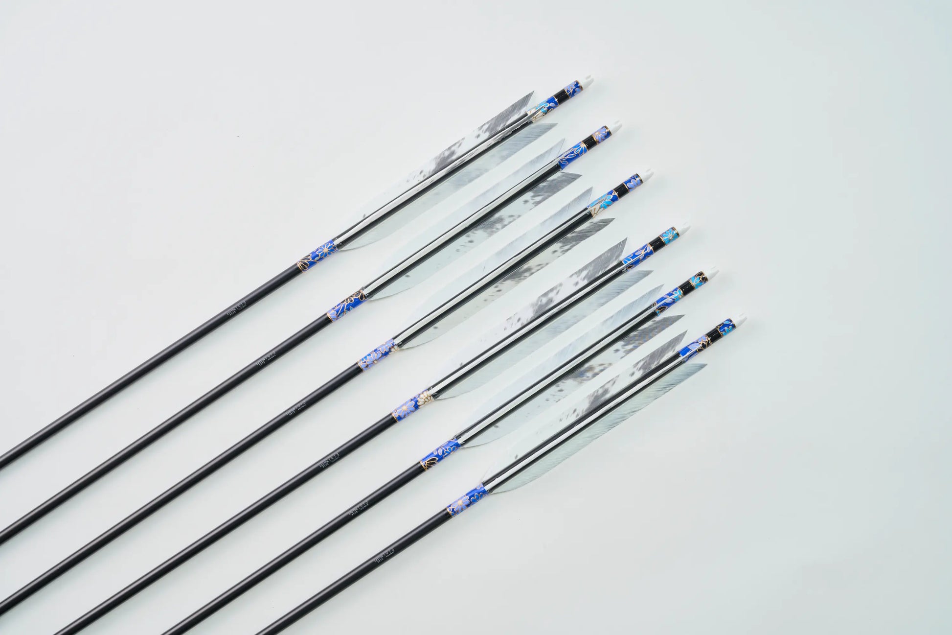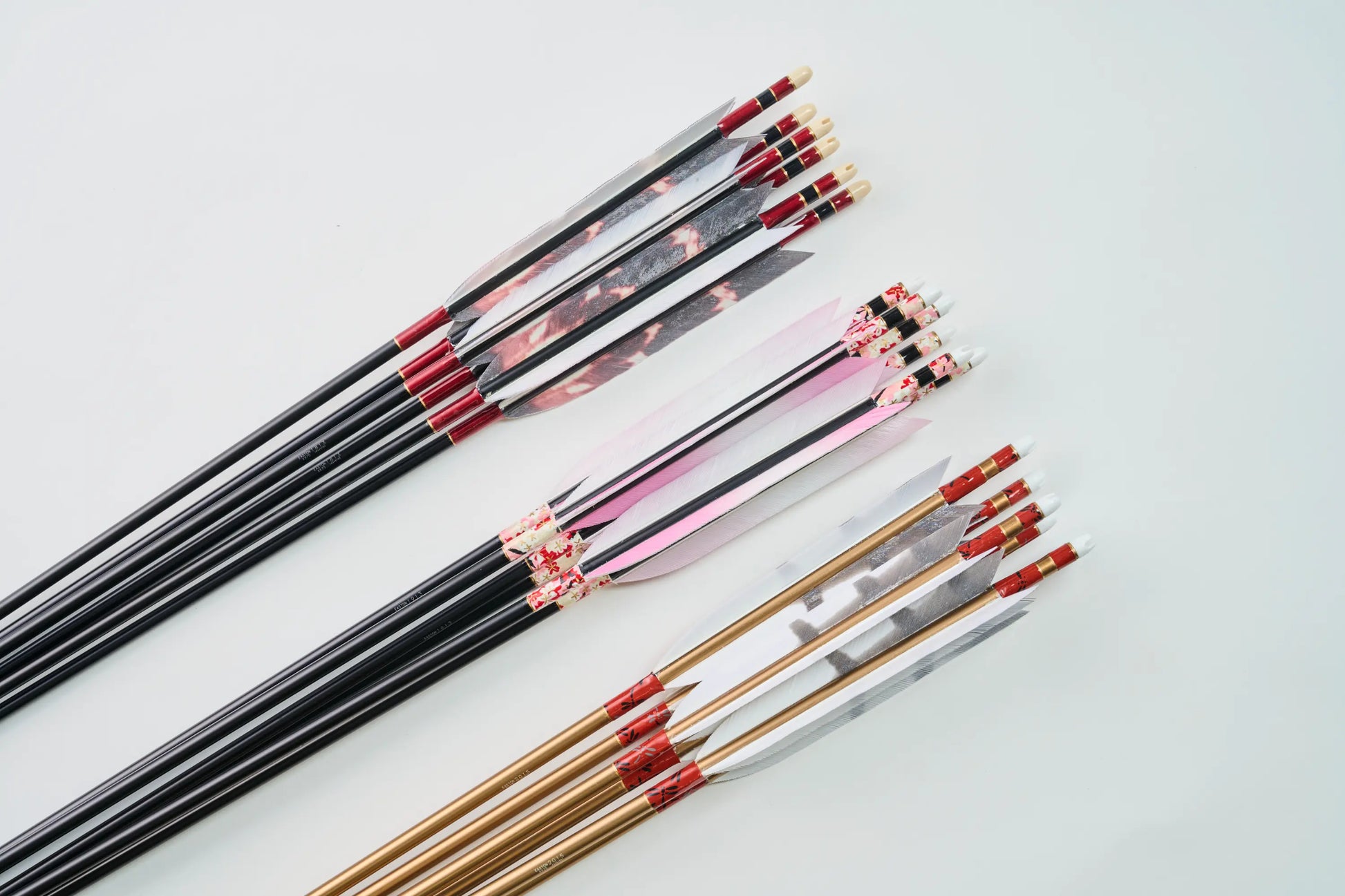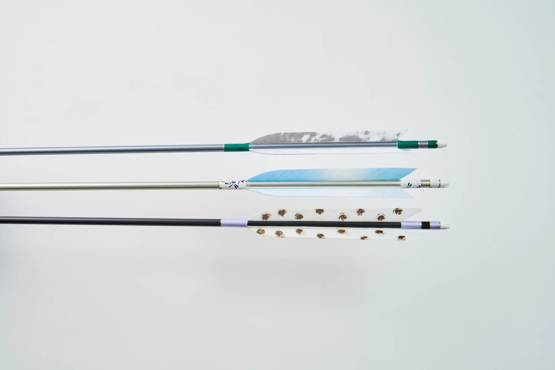 伝統的な漬け染めの基本色から、職人が一本一本手塗りする染め、発色の良い鮮やかなカラー染め、若い弓道家に人気の様々なデザインのアート風翼柄まで、豊富な種類の矢羽根をご用意しています。